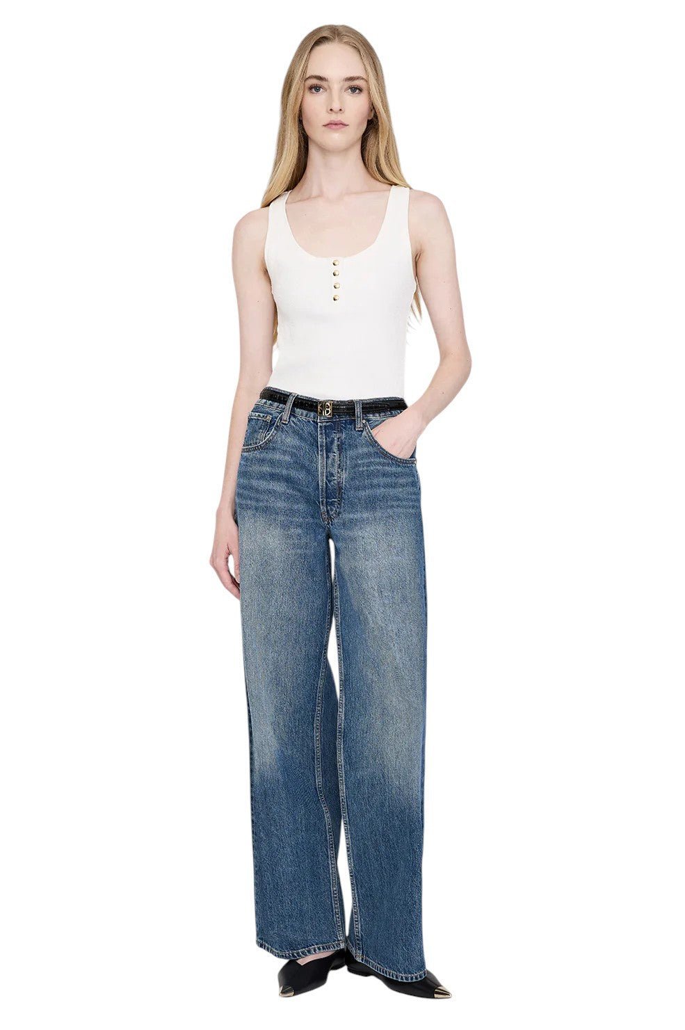 The “Alessia Tank” from Anine Bing is a modern, Henley-inspired top made from a dense cotton-spandex blend with an all-over ribbed texture and a soft hand feel. This elevated basic features a U-shaped neckline and gold monogram snap buttons along the front placket, making it a stylish and versatile addition to any wardrobe.