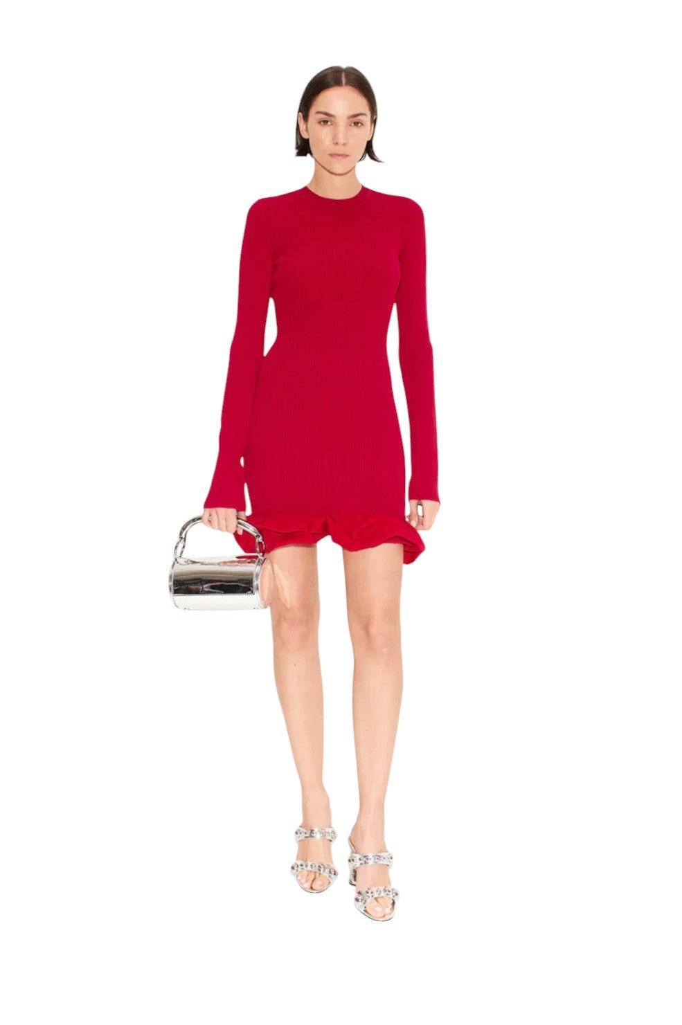 The “Otto Knit Poplin Combo Dress” from SIMONMILLER is a fitted long-sleeve knit mini dress featuring a poplin bubble hem, making a bold statement with its ruffled hemline.