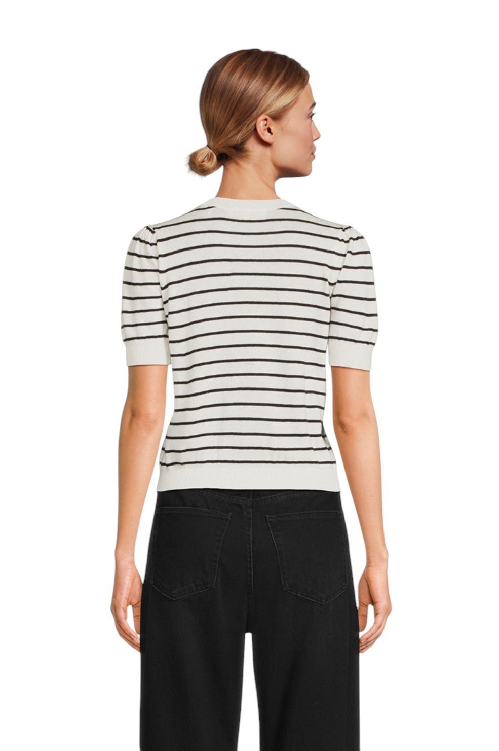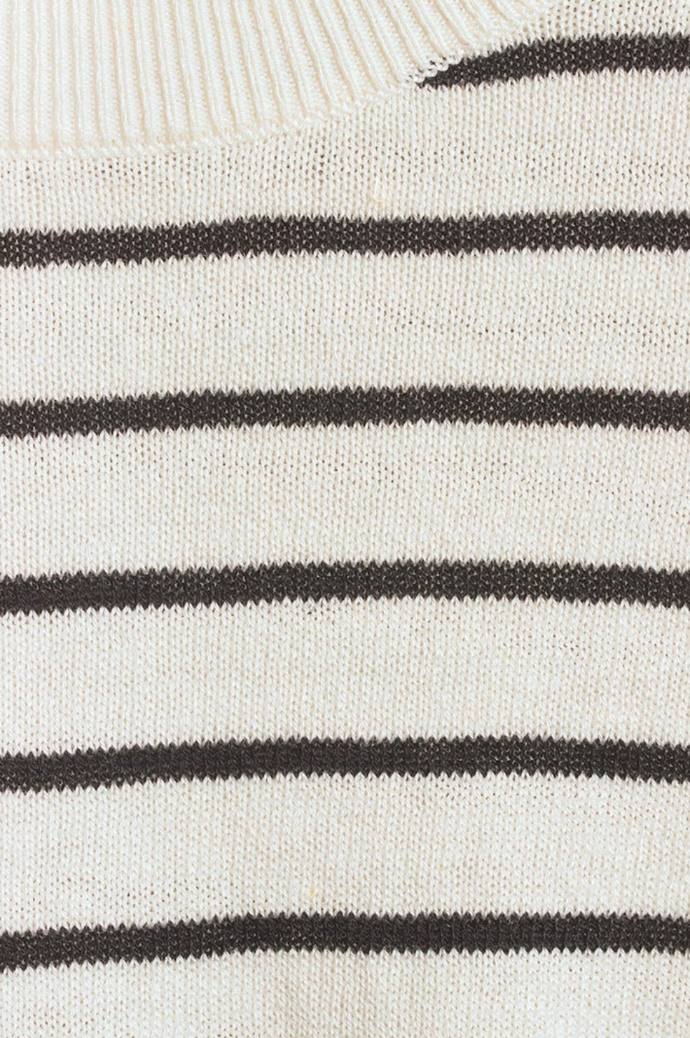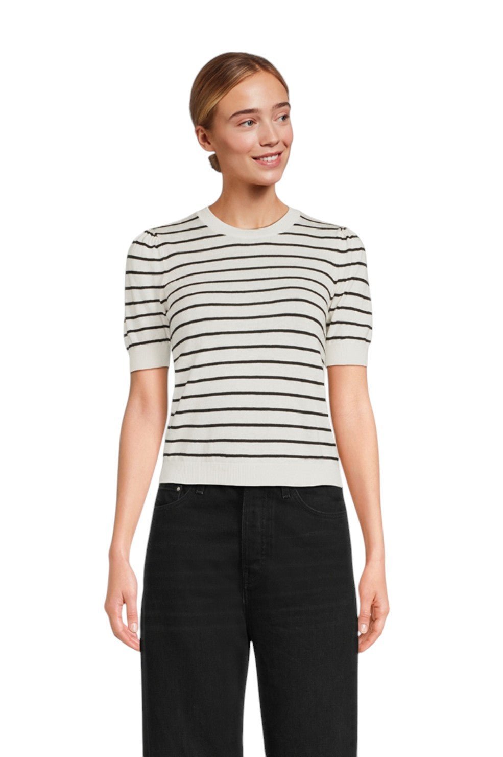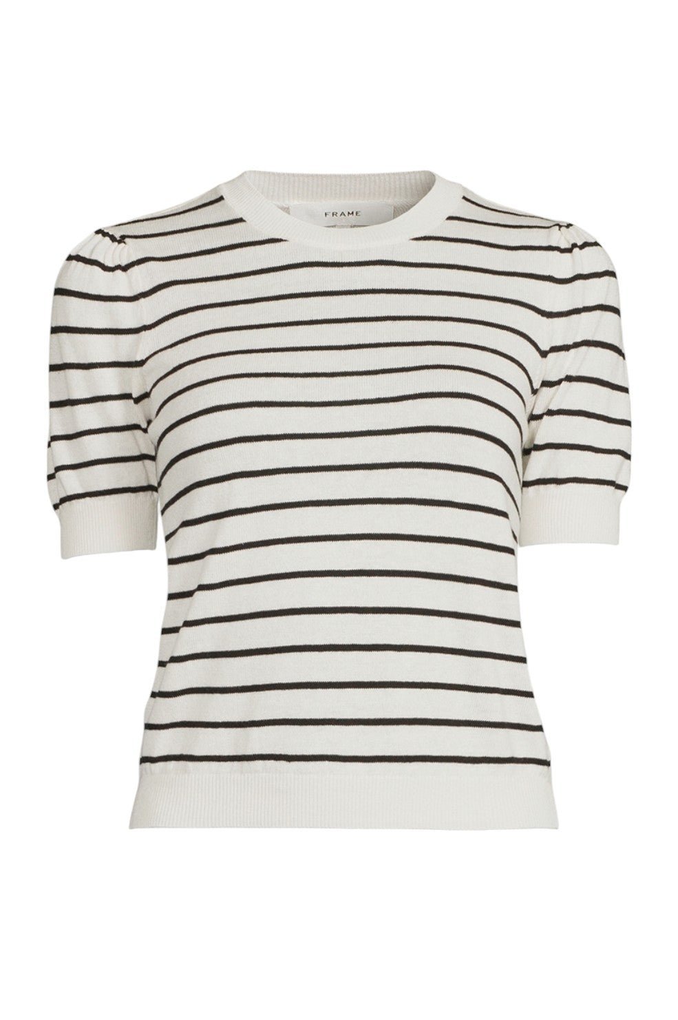 The “Gathered Sweater” from Frame features a nautical striped design, knit from a soft cotton-linen blend. With a fitted silhouette and elbow-length sleeves, this sweater exudes an authentic Parisian-inspired charm, perfect for adding a touch of effortless elegance to your wardrobe.